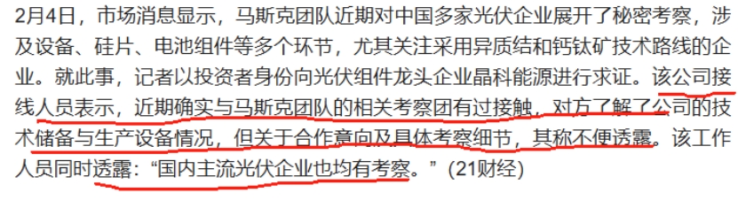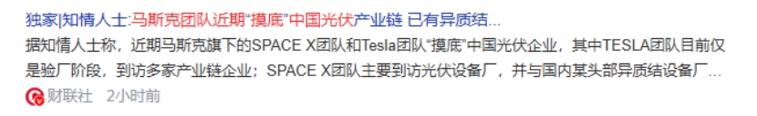 2月4日最新消息,近期马斯克旗下的SPACE X团队和Tesla团队“摸底”中国光伏企业,其中TESLA团队目前仅是验厂阶段,到访多家产业链企业;SPACE X团队主要到访光伏设备厂,并与国内某头部异质结设备厂有订单合作,但基于商业保密要求等因素,未作公开。