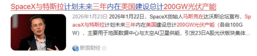 1月22日,在达沃斯论坛上,马斯克宣布宣布 SpaceX 与特斯拉将在 3 年内于美国建成合计 200GW/年的光伏产能(各 100GW),部分产能定向服务太空光伏组件生产,为太空卫星与数据中心供能,同时支撑地面 AI 算力需求,构建 “地面产能 -太空应用” 的能源闭环。