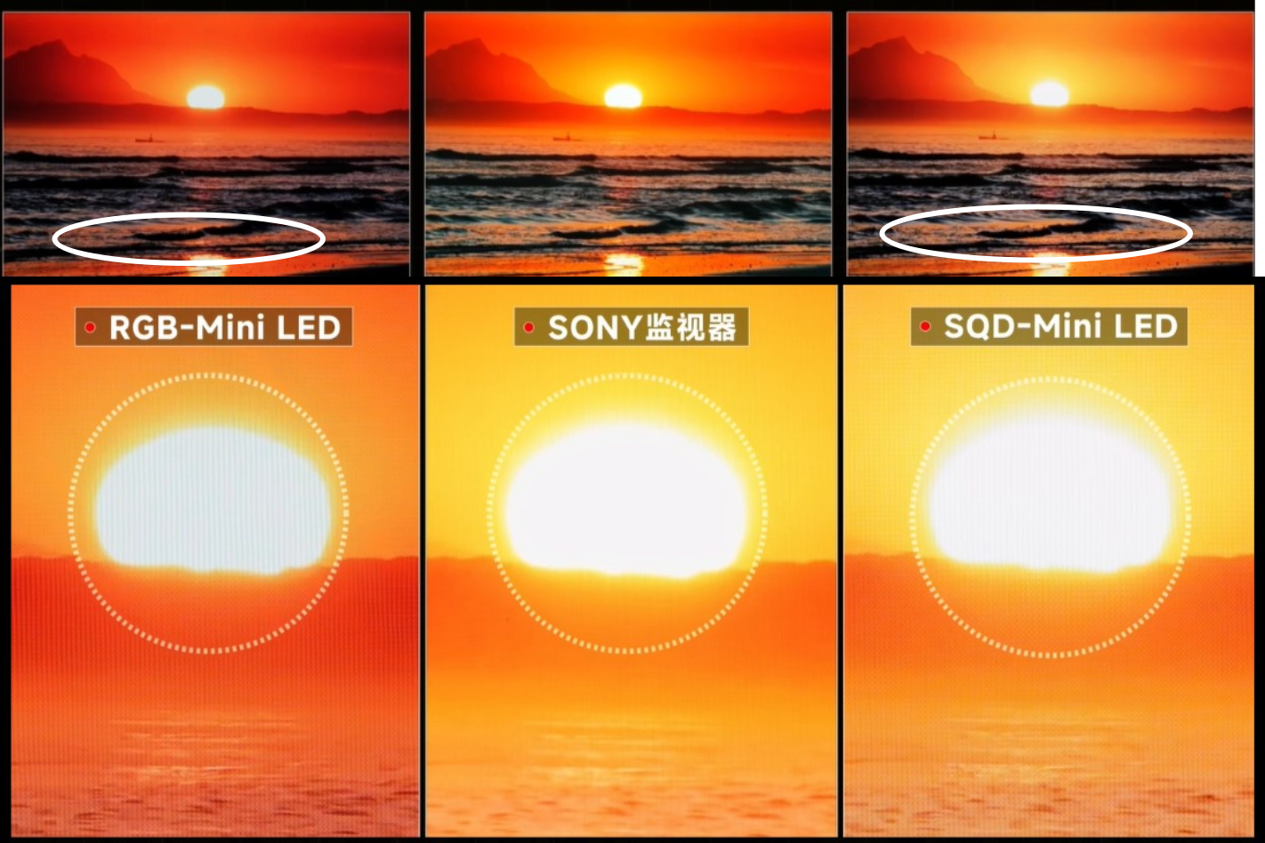 SQD-Mini LED的单灯发光效率则高得多。通过聚核光芯和绚彩XDR技术,亮度比普通多晶发光芯片提升53.8%以上,而且亮得持久、亮得出彩。同一日出画面下,太阳亮度更高且不过曝,光感接近真实视觉体验,海浪波纹清晰通透。跟专业监视器摆在一起对比,SQD的画面也是最接近专业监视器质感的。