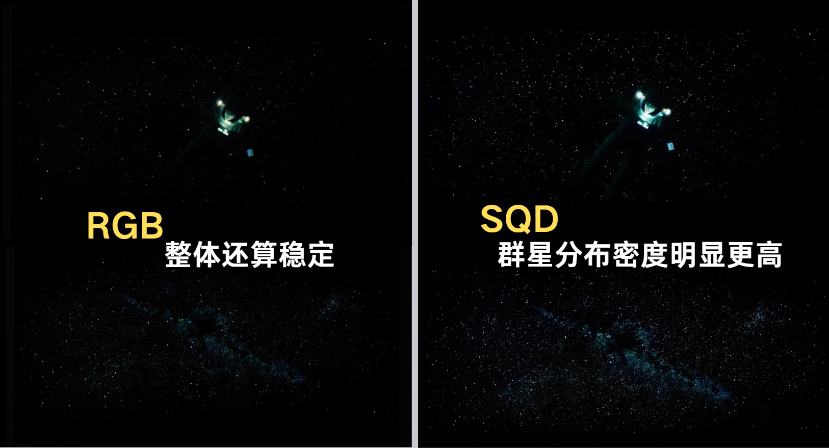 而SQD-Mini LED采用的万象分区技术,一灯就是一组物理分区,在同样成本下分区数量是RGB的3倍以上,控光精度领先几个身位。在同样的太空场景中,画面细腻澄澈,星点清晰密集,明暗过渡自然,黑场深邃干净——这才是高端Mini LED应有的水准。