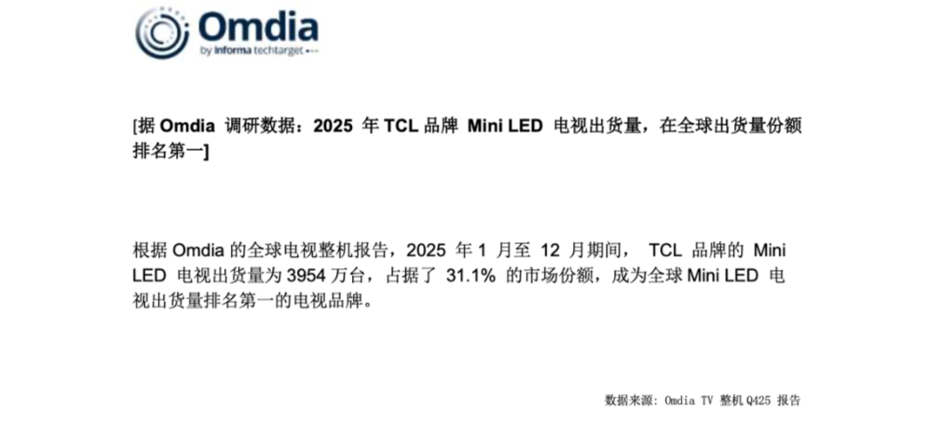 更重要的是,SQD的普及速度远超RGB。这也得以于TCL在Mini LED技术的深厚积累、量子点专利的先发优势,和TCL华星这种自有屏厂的供应链掌控。而且据Omdia数据显示,TCL的Mini LED全球出货量已连续5年稳居第一,2025年全球市占率高达31.1%,这实力也经过了市场验证的!