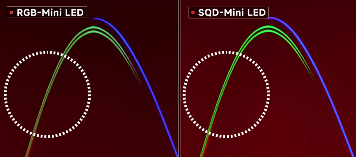RGB-Mini LED最大的宣传卖点就是高色域。但问题在于——它挑画面。显示大面积纯色时确实出彩,但一旦切换到复杂多色画面,色域值就会骤降10%左右,串色、偏色问题随之而来。例如在红背景下显示绿色线条,RGB画面中绿色直接串成黄色;而SQD画面中的绿色依然鲜艳准确,红蓝底色也更加纯正饱满。