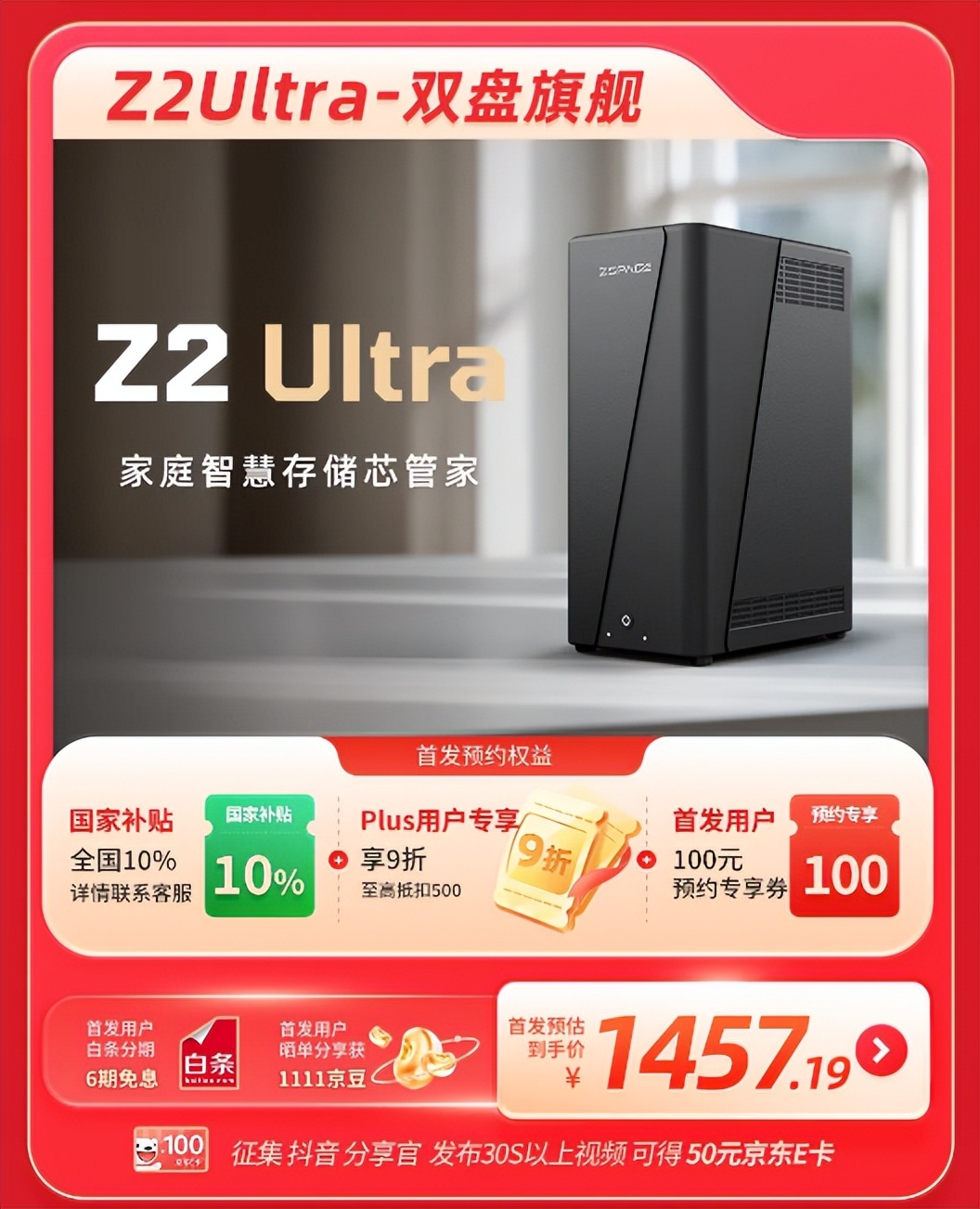 顺便提一句新品 Z2Ultra,现在已经开启预约,精巧外观兼顾性能与美学,直通式散热超静音,双盘位设计很适合注重家居风格的家庭,升级到和Z4Pro+同样的处理器,小身材,高性能,同样享受一样的优惠待遇,预估上市到手价不高于1457元,值得有需要的同学去预约。