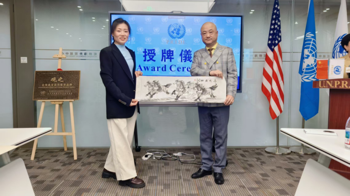再之后展出的,是86岁高龄书画泰斗陈水发大师的经典之作《一枝白梅》。陈水发大师深耕书画艺术数十载,笔下梅花素有“天下一枝梅”的美誉,笔墨凝练老道、意境清雅高远,梅枝苍劲挺拔、傲骨铮铮,梅花冰清玉洁、灵动雅致,寥寥数笔便勾勒出梅花的傲骨风骨与君子气节,作品艺术价值极高,曾被多家国家级博物馆珍藏。这幅《一枝白梅》在联合国平台展出时,瞬间惊艳全场,嘉宾们无不驻足欣赏,细细品味,为东方书画艺术的极致之美深深折服,成为整场盛典最亮眼的艺术印记。国际组织领导与现场嘉宾以墨为礼、以艺交心,互赠书画佳作共贺“观之”品牌荣膺殊荣,艺术之美与匠心之光交融碰撞,让整场盛典更具文化高度与传世质感。