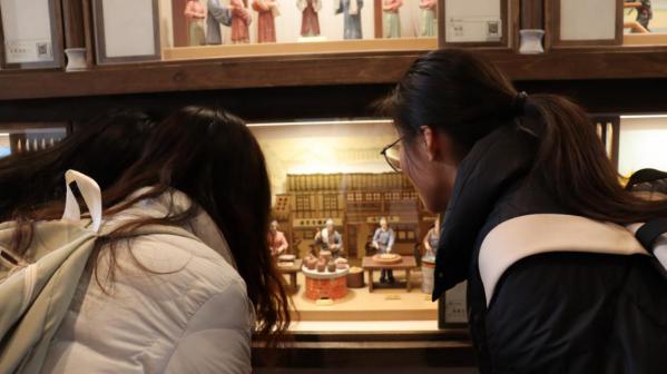 随后,实践队走进位于三坊七巷的福建省民俗博物馆,沉浸式感受春节民俗的精彩魅力。这里运用场景复原、多媒体互动等多元形式,生动鲜活地呈现了福州春节的传统习俗。馆内陈设的“闽式生活图鉴”微缩景观,以泥塑形式还原了福州春节除尘、贴福、迎神、舞龙等场景,让队员们直观感受到年俗文化与日常生活的深度融合。通过馆内多媒体影像与文字资料,队员们详细梳理了游神民俗的历史渊源。作为福州春节期间的一种仪式,游神不仅是祈福纳祥的传统习俗,更凝聚着乡亲邻里的情感联结,是闽都文化中 “敬祖崇贤” 基因的鲜活体现。如今的游神活动既保留了巡境展演、祈福致辞的核心环节,又通过路线优化、安全管控、短视频传播等现代手段,成为文旅融合的重要载体。这让队员们深刻体会到,传统民俗唯有扎根时代土壤,才能持续焕发生机。
