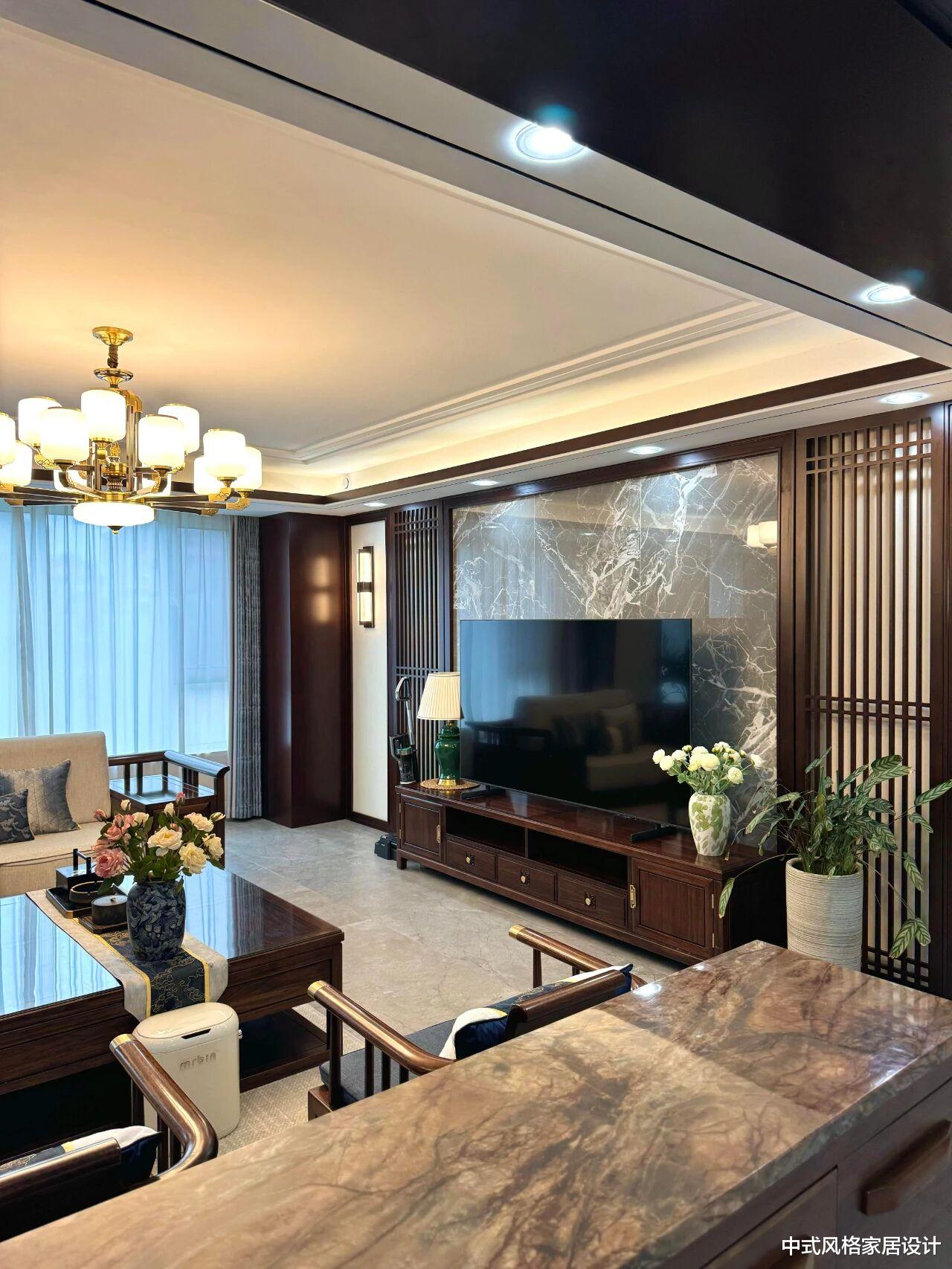巧妙地使用屏风、格栅等半隔断元素,是新中式风格的又一特色。这些元素既起到了划分空间的作用,又保持了视觉上的连贯性。一扇木质格栅电视墙,不仅彰显了东方美学特征,还能让光线柔和地穿透,在空间中创造出丰富的光影变化。