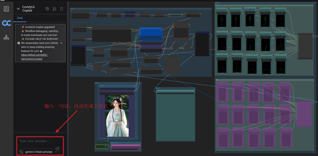 在RunningHub里面,内置了全球各种的大模型,wan2.6、veo3.1、海螺、Banana、sora、suno-v5等等,这里就不全说了。在里面可以自己搭建工作流,也可以下载别人的工作流使用,如果你啥都不会的,只要说一句话,它也会给你自动生成工作流,再也不用自己去写了。