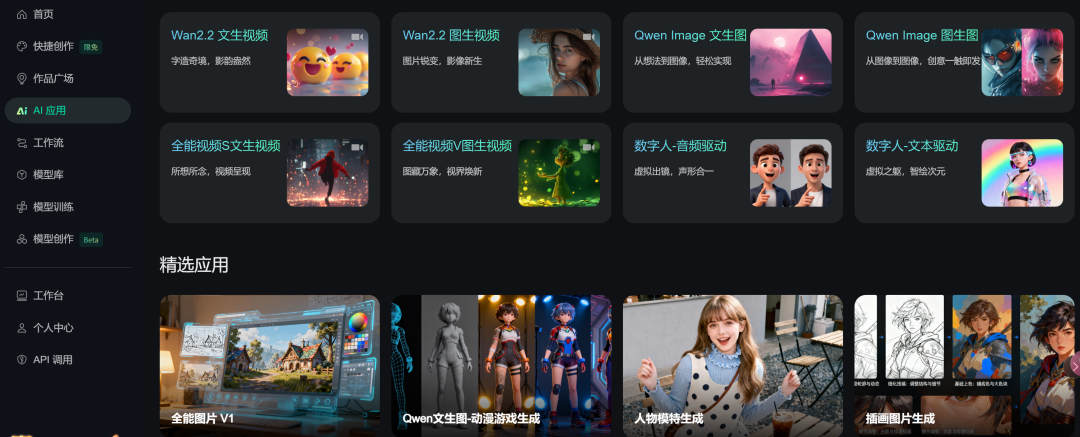 那么,你可以在里面训练自己的模型,打造自己的品牌。你想要怎样的工具,在里面搜索关键词,都有各种应用和工作流让你挑选。如果你对工作流方面很熟悉的,那就恭喜你了,因为你的工作流发布出去,有人使用了就有收益了,这是一举两得呀。