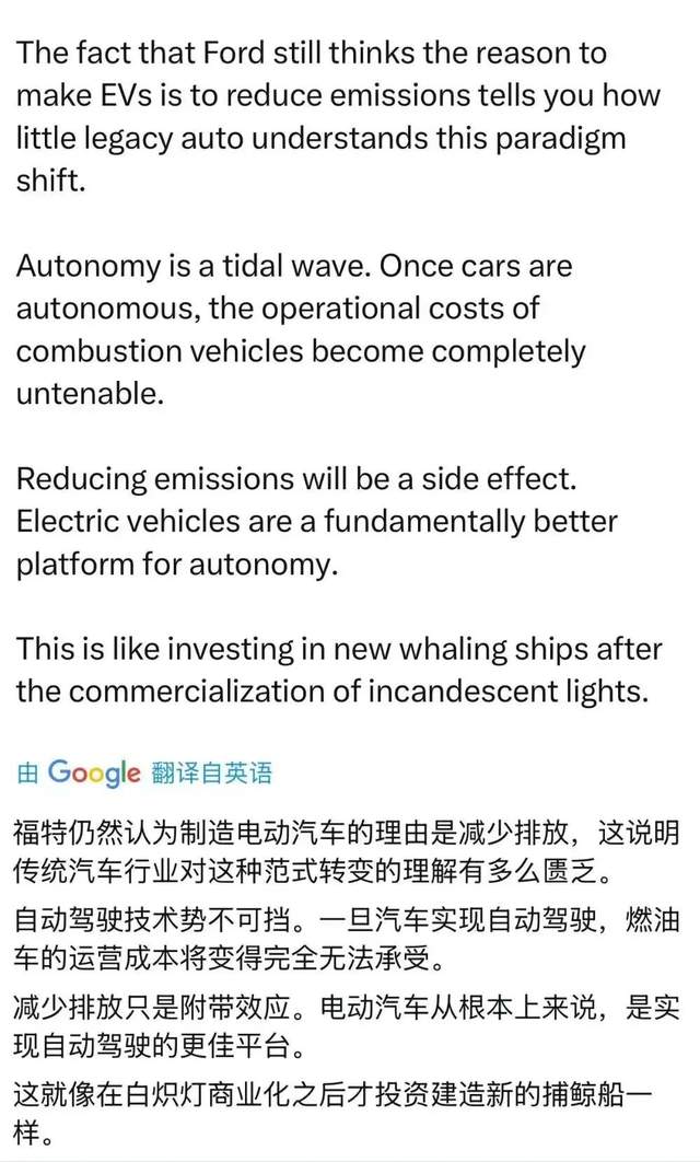 一位网友写道:“福特仍然认为生产电动汽车的原因是为了减少排放,这一事实告诉你,传统汽车对这种模式转变的理解是多么的少。自主是一股浪潮。一旦汽车实现自主化,燃油汽车的运营成本将完全无法维持。减少排放只是一个副作用。电动汽车从根本上来说是一个更好的自动驾驶平台。这就像在白炽灯商业化之后投资新的捕鲸船一样。”