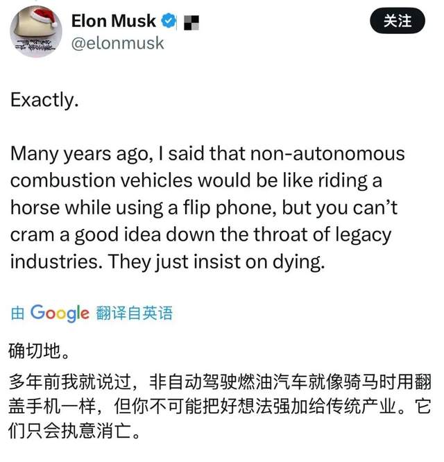 马斯克对此回应:“完全正确。多年前,我就说过,非自主内燃机汽车就像一边骑马一边使用翻盖手机,但你不可能把一个好主意硬塞给传统行业。他们只会执意消亡。”