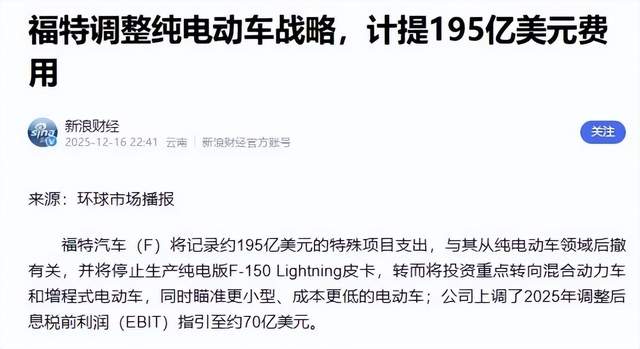 福特宣布,此次战略调整将计入高达195亿美元的特殊项目支出,这笔巨额损失,成为它转向必须付出的“学费”。