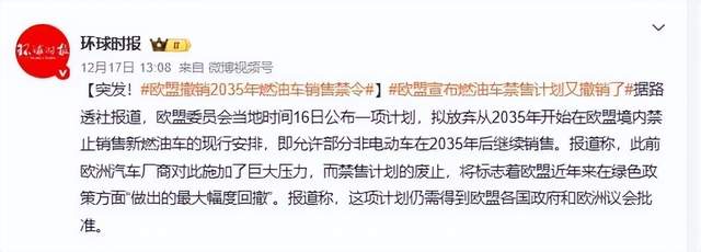 美国此前已经放宽了尾气排放规定,给了燃油车和混动车型更多生存空间。而当地时间12月16日,欧盟委员会更是公布新议案,直接取消了2035年禁止销售燃油车的方针。