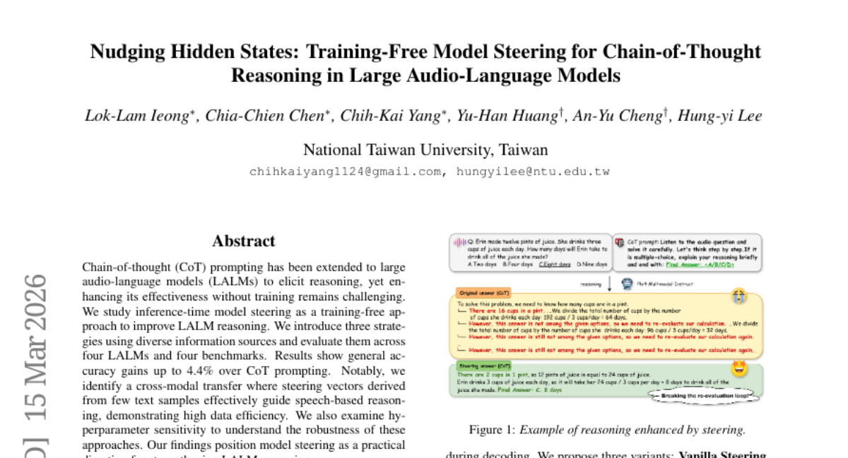在人工智能的世界里,让机器像人类一样思考一直是个巨大挑战。当我们遇到复杂问题时,会自然地分步骤思考,比如解数学题时会先分析条件、再列方程、最后求解。但对于能理解声音的AI模型来说,这种"拐弯思考"能力还不够强。最近,台湾大学的研究团队发现了一种巧妙的方法,能让这些AI在不需要额外训练的情况下,变得更会思考。这项研究发表于2025年的arXiv预印本平台,编号为arXiv:2603.14636v1。