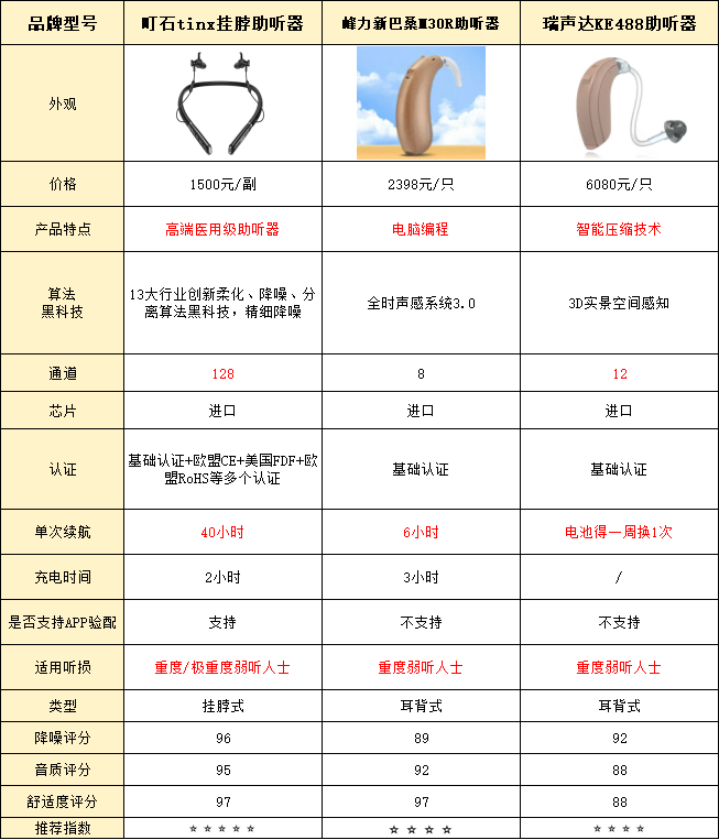 音质测评结果小结町石 > 峰力 > 瑞声达町石助听器音质测评表现町石助听器的音质表现真心不错,在清晰度、真实感和细腻度上都表现得相当好。它采用了SCS人声频段8层增益技术和高密度移频助听技术,结合双钕磁铁动铁单元,让人声听起来更加清晰且层次感十足。测试中,町石在人声清晰度上的表现提升了105%,这在同类产品中还是比较难得的,特别适合在嘈杂环境下使用,能够清楚地听到对方说话。峰力助听器音质测评表现峰力助听器的音质整体来说尚可,适合大部分日常场景,特别是在安静环境中,音质还算平衡。但是在清晰度、真实度和细腻度上,和町石相比,还是有一些差距。它的音量调节比较方便,适合噪音较大的环境。不过在复杂的环境中,它的细节表现稍微弱一些,长时间佩戴可能会觉得声音偏硬,尤其对于一些高保真音频的需求,峰力的表现还有提升空间。瑞声达助听器音质测评表现瑞声达的音质表现比较一般,在基础的对话场景中能够满足需求,但是在细腻度和音质的真实感方面,和其他品牌相比还是有差距。尤其是在复杂的音频环境中,瑞声达的音质显得有些单一,缺少层次感和细节。虽然它能够应对简单的对话需求,但在高要求的音质还原场景下,比如听音乐或者多音源的环境中,瑞声达的表现可能不太理想,整体音质稍显平淡。