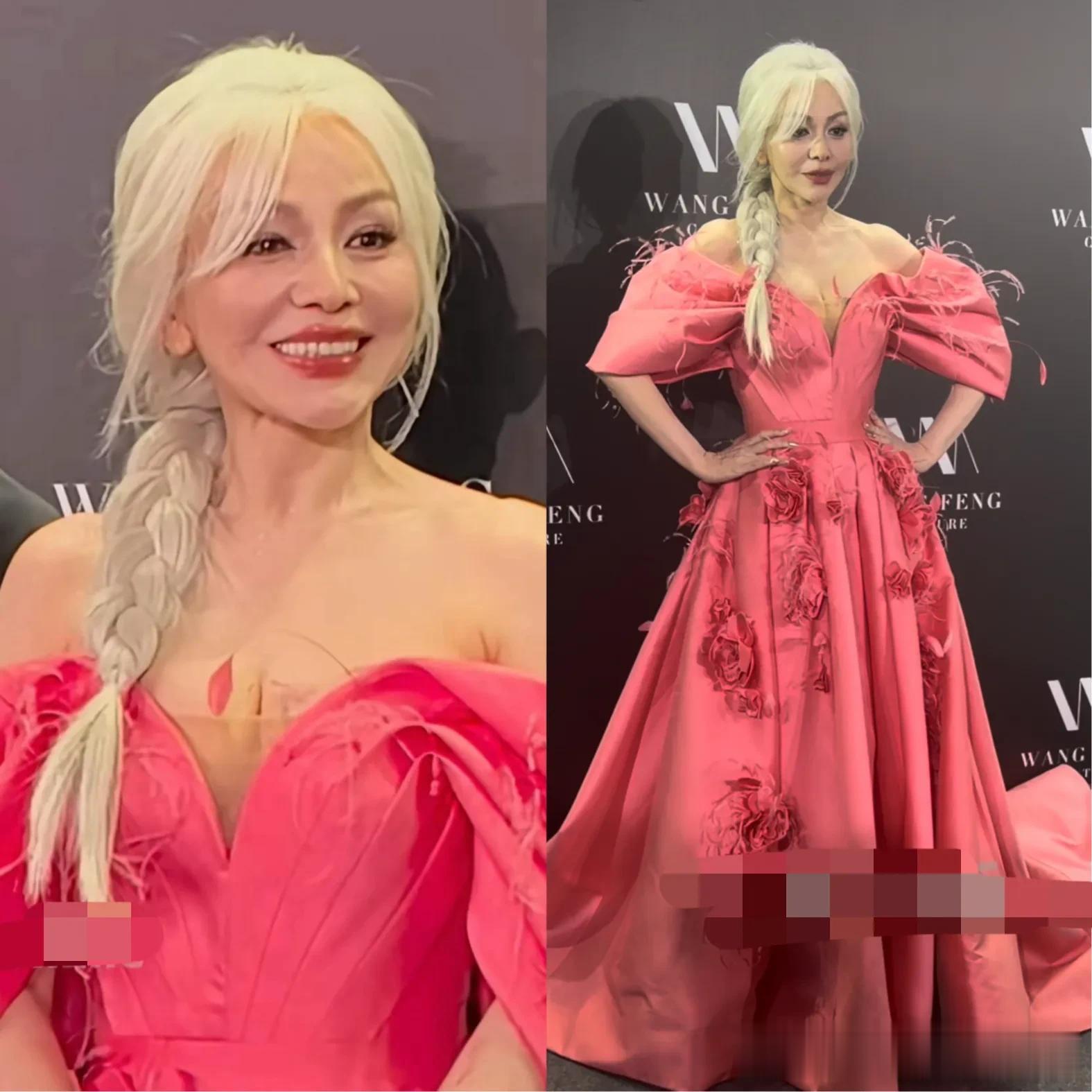 她身穿深V粉色花朵裙,搭配一头白色假发,据说这个造型是为了COS艾莎公主。