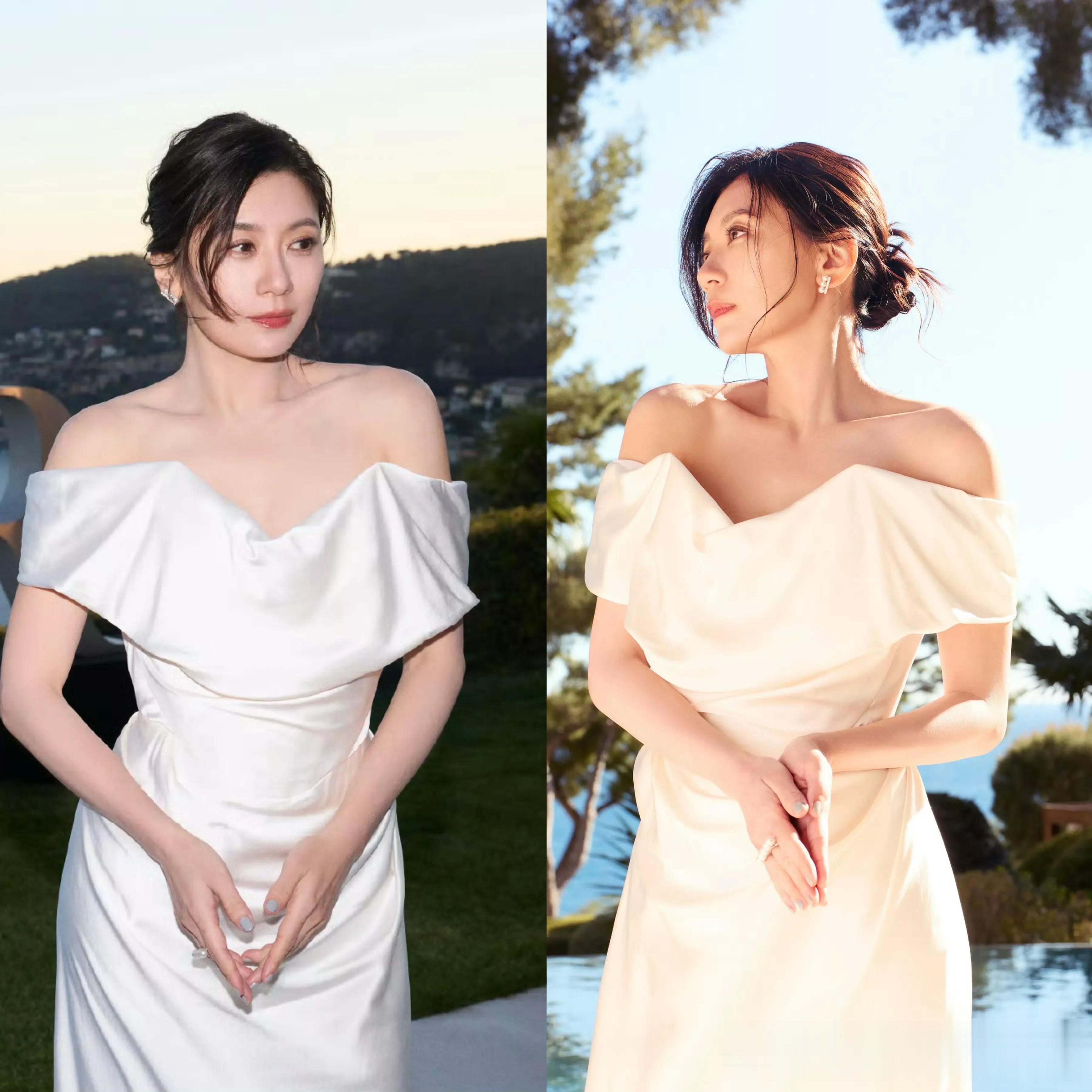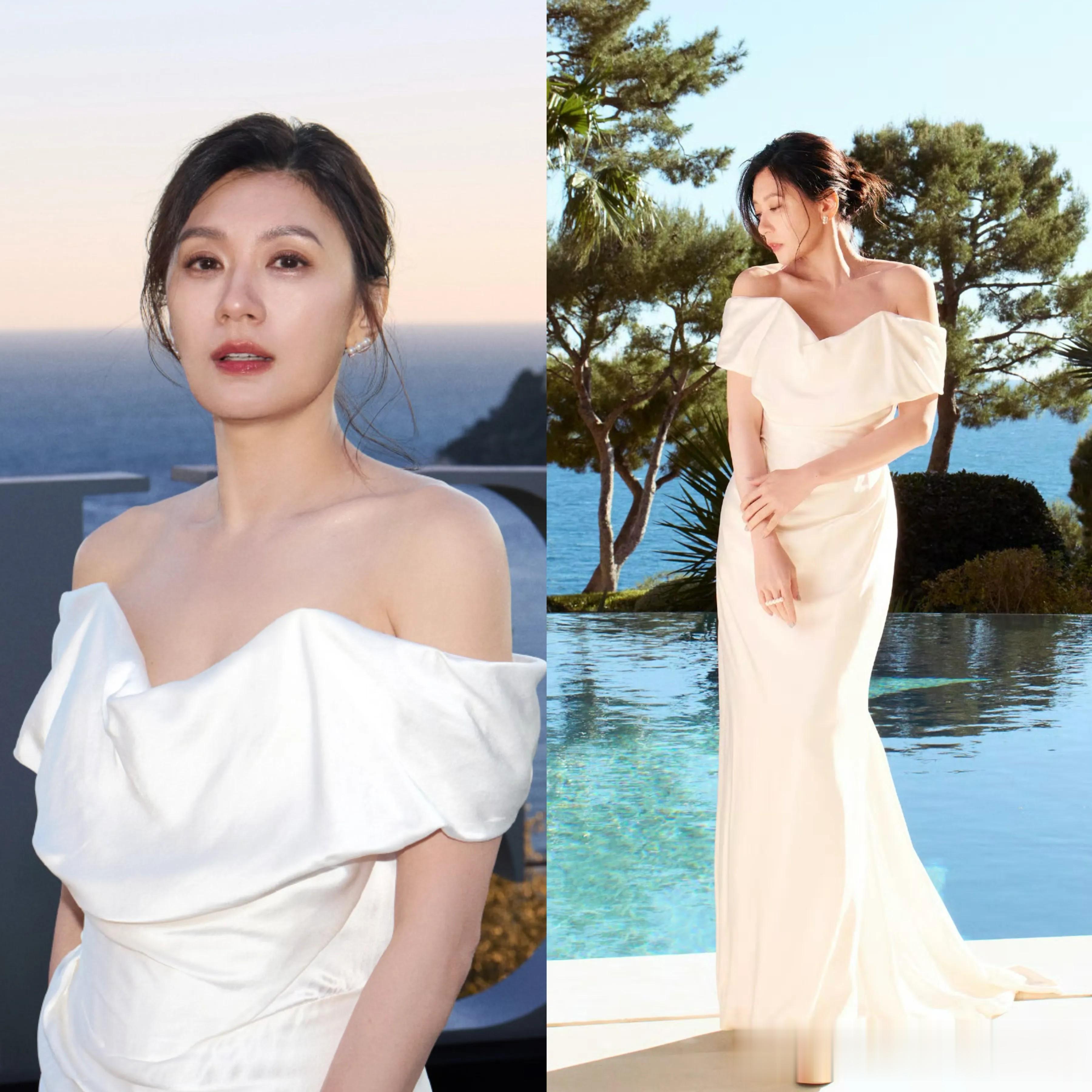 一袭一字领缎面长裙的她,梳了个很简约的盘发,妆容也很淡。但就是这么一套很清爽的造型,却突显了她的温婉大气。