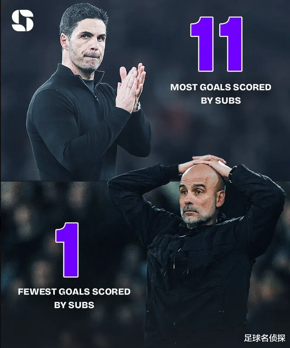 同时,曼城本赛季只通过替补球员打进了1球,是英超最少的。
