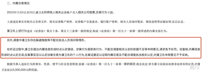 《行政处罚决定书》显示,调查中潘卫东还存在躲避推脱等不配合执法人员询问等情形。