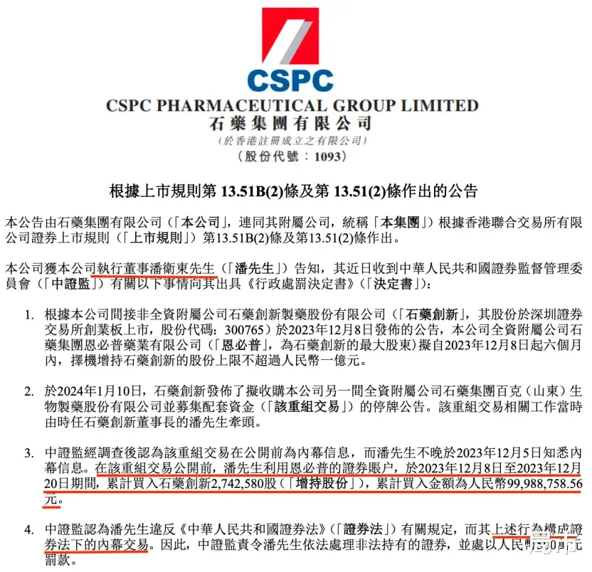 实际上,潘卫东利用石药恩必普的证券账户,在重组消息发布前,于2023年12月20日已完成了上述增持。