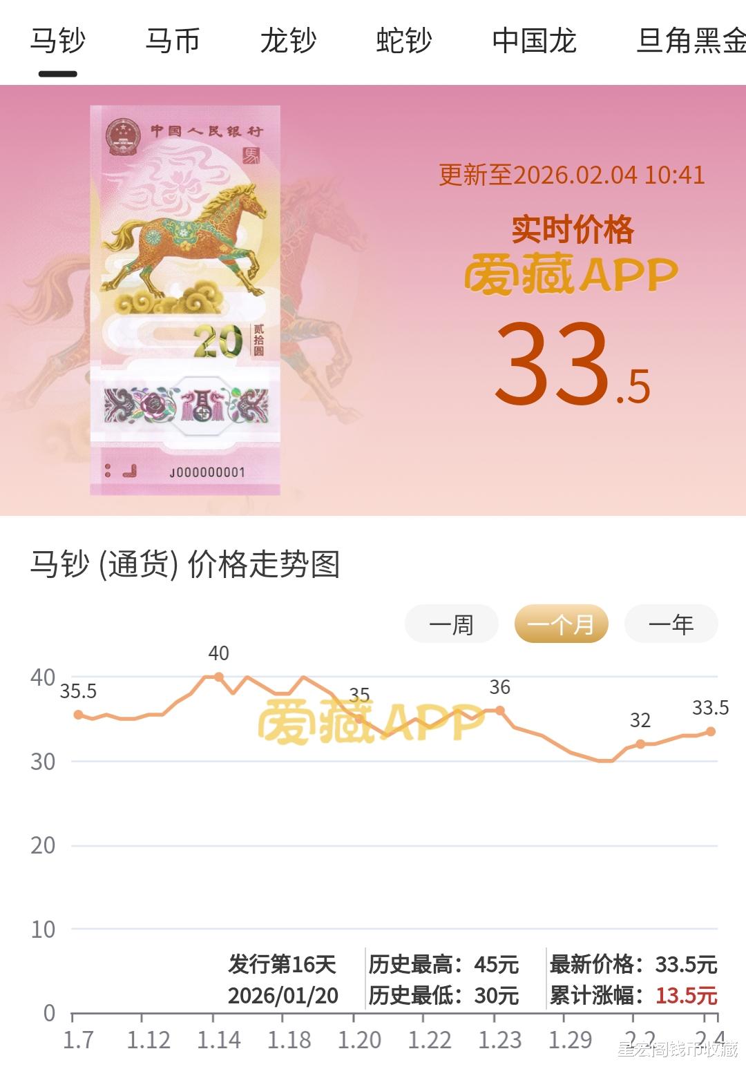 2026年马年纪念钞通货标准十连,目前收购报价也已经达到了33.5~34元左右。
