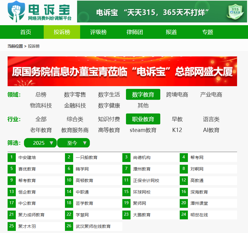 2025年至今,根据“电诉宝”受理投诉中涉及的数字教育中职业教育领域用户有效投诉显示(依据投诉量排行),“中安建培”排名第1位。最新评级为“不建议下单”。除此之外,其他被投诉的类似平台还有:一只船教育、尚德机构、帮考网、赛优教育、嗨学网、潭州教育、对啊网、帮考教育、高顿教育、正保会计网校、高教通、恒企教育、中职通、环球网校、深海教育、中公教育、芸学教育、聚师网、潭州课堂、聚力成师教育、学慧网、大鹏教育、明世在线、聚才木羽、武汉聚师在线教育。