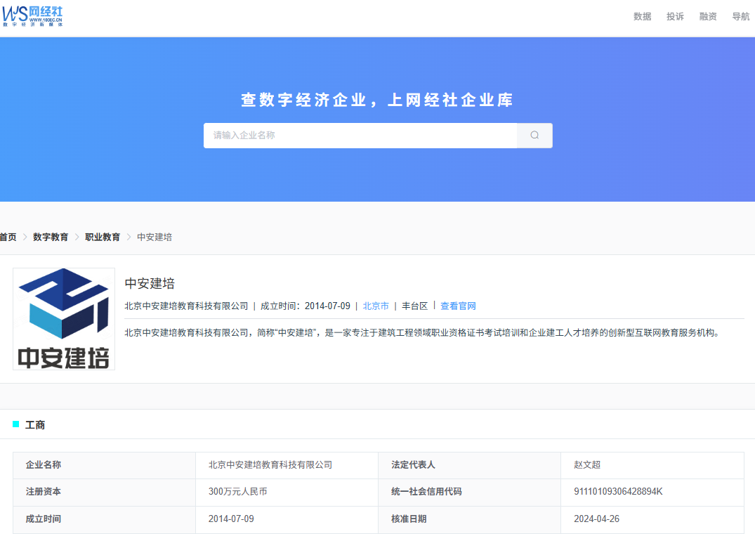 据网经社企业库显示,“中安建培”属于北京中安建培教育科技有限公司,成立于2014年7月9日,法定代表人为赵文超。