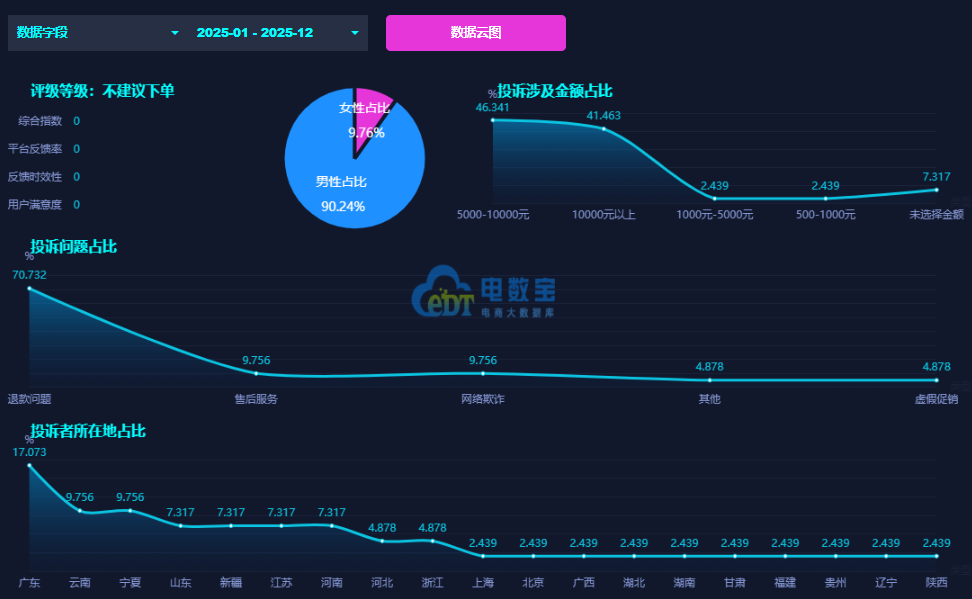 据网经社旗下电商大数据库“电数宝”监测数据显示,“中安建培”2025年至今投诉的问题主要包括退款问题、售后服务、网络欺诈等,其中退款问题占比最高,达到了约70.7%。