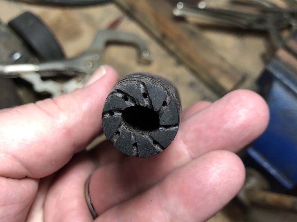 电线安装要安装金属丝,还需对手柄进行少许额外加工。从金属丝槽道的末端起点开始,向手柄两端各开一段新槽,其长度至少需达到手柄外侧到刀茎槽距离的一半。使用Dremel或Foredom电动工具最为合适,但锉刀亦可完成。若使用锉刀,建议直接开槽至刀茎槽处——这样操作更简便,且在刀具组装后完全不可见。这些槽道的深度必须与金属丝直径完全一致,以确保安装金属丝并完整组装刀具后,手柄能与护手或柄头严密贴合。开槽时使槽线呈倾斜角度而非垂直于圆周切割,这将便于后续拉紧操作。