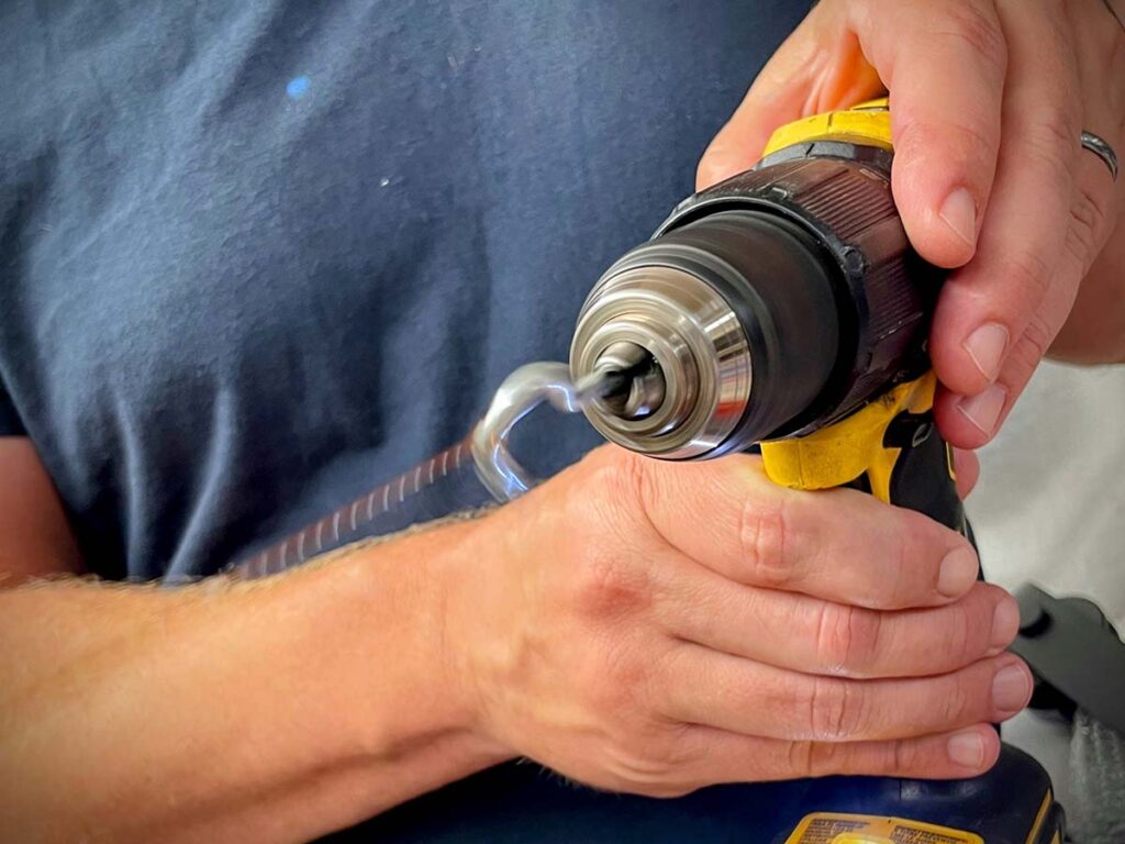 将钩子夹入手钻,钩住已形成的大线圈,拉紧它并启动电钻。保持张力恒定——随着你扭紧金属丝,它会将你拉向台钳的方向。