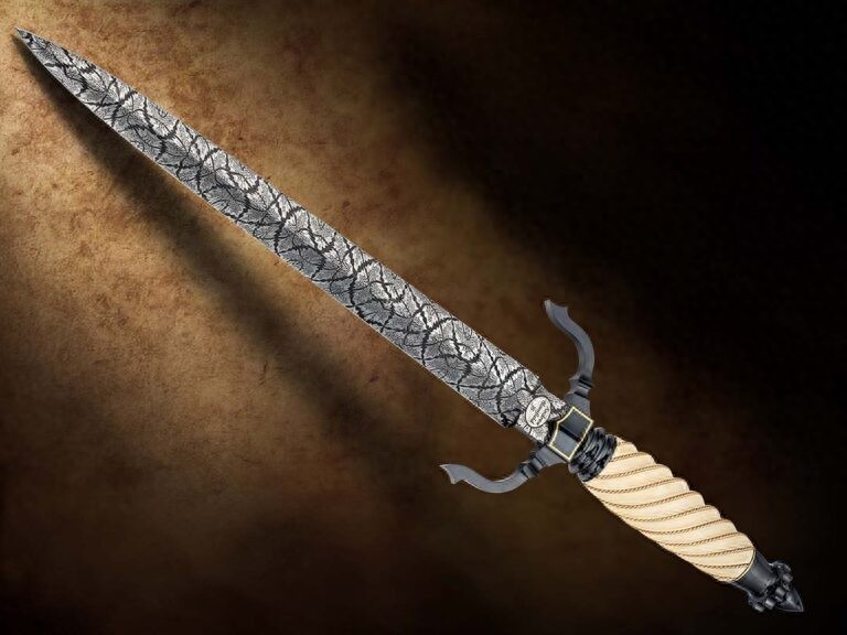 ABS大师级刀匠安德鲁·布洛姆菲尔德以金丝缠绕猛犸象牙柄,打造了这款十字护手匕首。其11.5英寸(约29.2厘米)的刀身采用马赛克大马士革钢锻造。整体长度18.5英寸(约47厘米)。