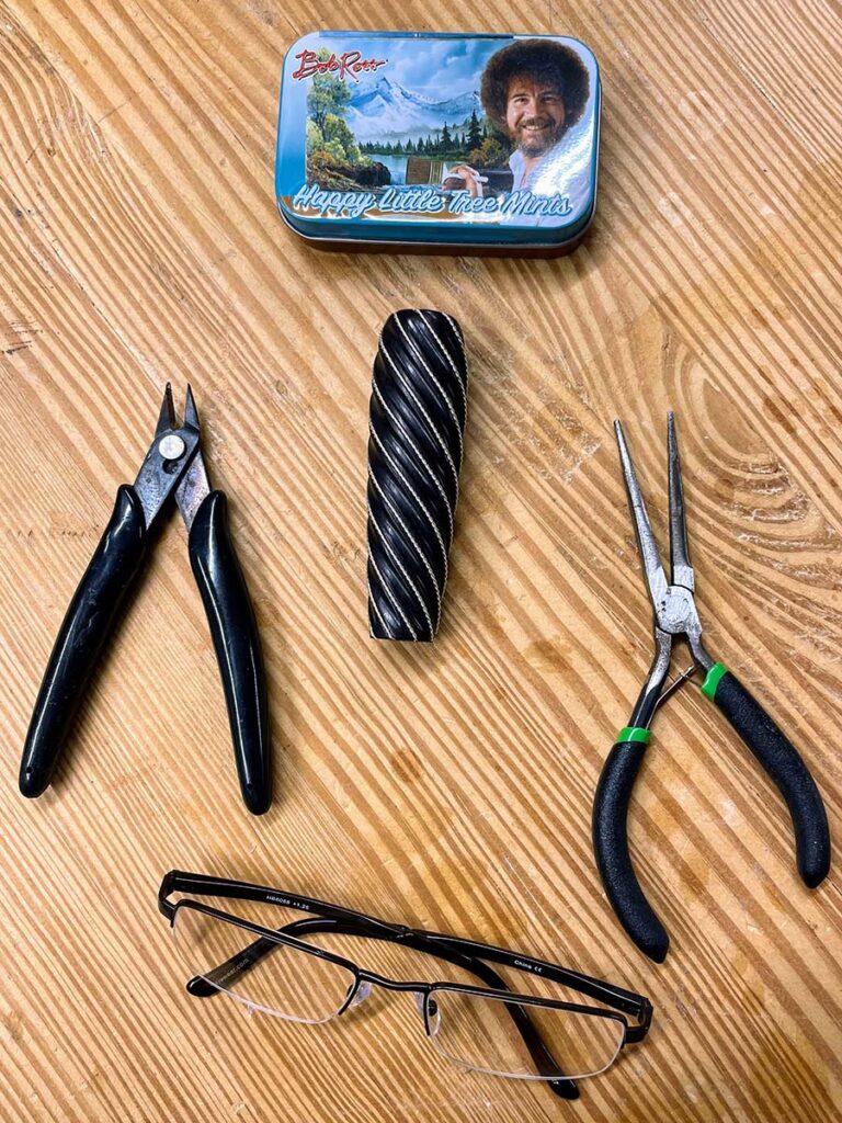 要使金属丝软化回原始状态,必须进行退火处理。具体操作是:将金属丝紧密缠绕在直径约2英寸的管状物或类似物体上,并用细线固定线圈。用丙烷喷枪均匀加热线圈,直至其微微泛红。有一个防止金属丝熔化的技巧:先用锐记号笔将金属丝整体涂黑,当油墨完全烧尽时,即可停止加热。