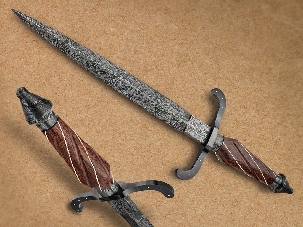 银丝缠绕于杜安·博马所制匕首的红木握柄之上。其10英寸(约25.4厘米)的刀身采用1084碳钢与15N20镍合金钢锻造的大马士革钢制成。整体长度15英寸(约38.1厘米)。