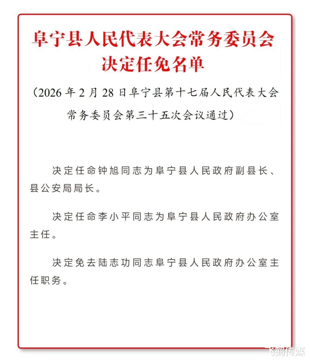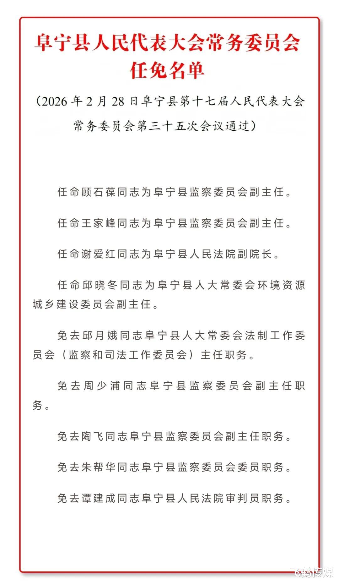 阜宁县人民代表大会常务委员会决定任免名单