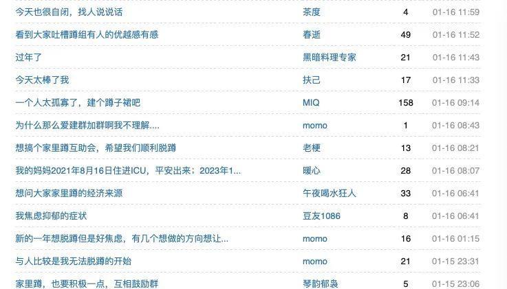 我最低迷的时候,经常在豆瓣“家里蹲”小组潜水,加了各种各样的家里蹲、茧居族、隐蔽青年的群,最多的群有200、300人,我特别emo的时候,就想找有没有人跟我有相似的经历。我希望能从这些人身上找到解决的态度,事实证明,这很有限。