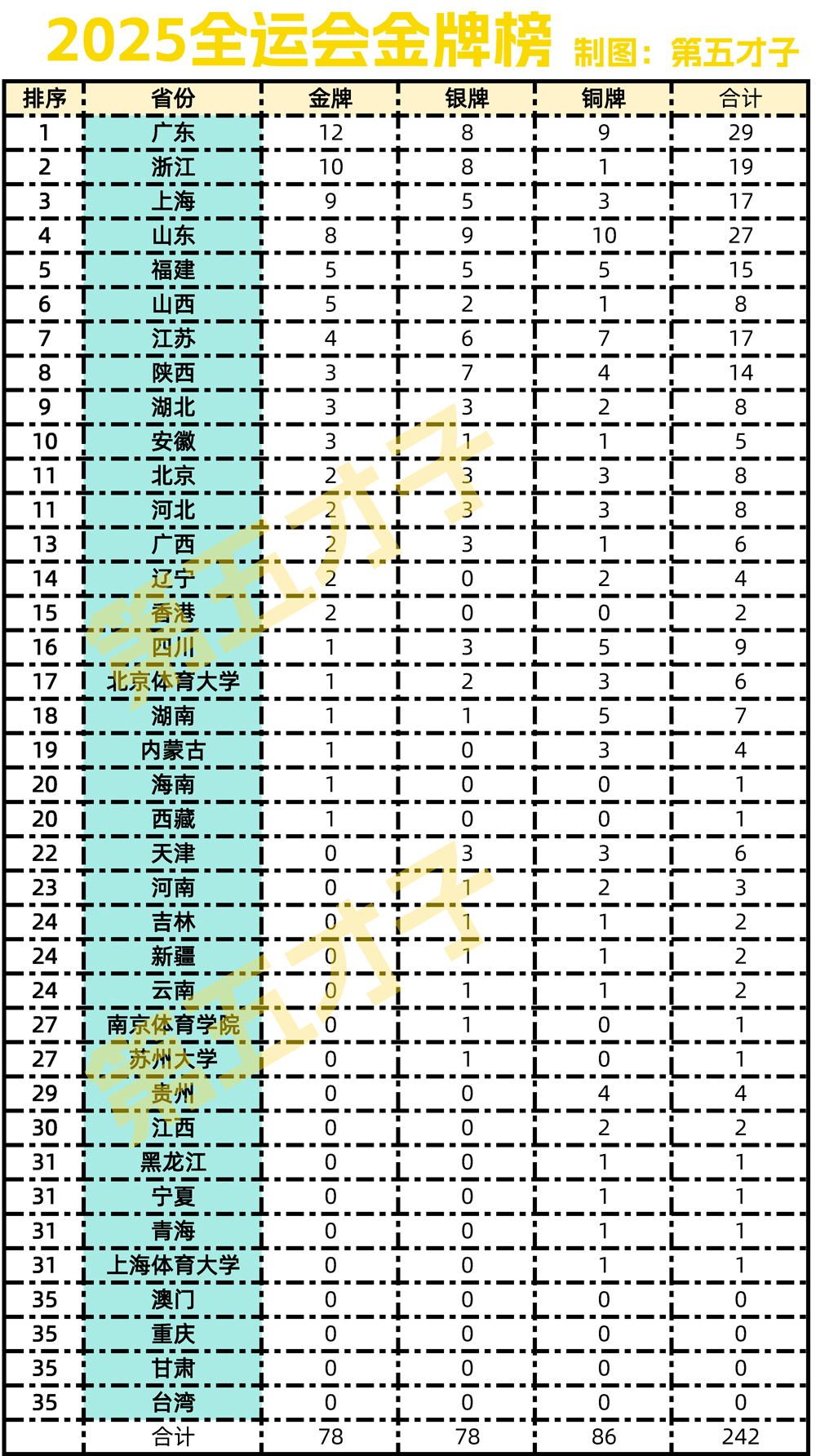 奖牌榜基本规则,2025全运会金牌榜(奖牌榜)第五才子版本数据来自15运官网,由第五才子制图,目前涵盖34个省级行政区(无论是否有奖牌)及其他已有奖牌入账单位。其中一些参赛单位单列(如北体大,南体院),主要是考虑一些集体项目不好归类,个人项目其实是可以归类到某个省区市的。此外,该奖牌榜暂时只统计本届全运会的奖牌,未计入冬运会、青少年三大球、青少年田径运动会的成绩,这是参考夏奥会也没有计入冬奥会成绩、本届全运会三大球也设置了青少年组的比赛等因素,当然后续也可以再做一张带入这几项赛事的综合奖牌榜。