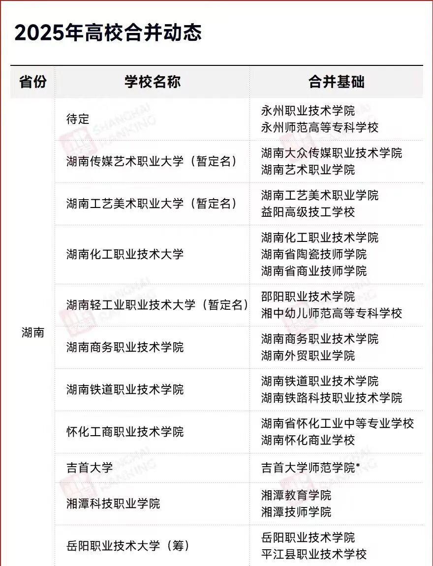 今年关于大学合并的消息那是越来越多,特别是湖南,早在 2024 年就发布了《高校布局优化实施方案》,明确提出 “整合同质化院校”“推动师范专科并入本科或高职”。就这短短一年,当地近十所大学都已经有了初步合并方案,有的甚至都开始合并招生了。