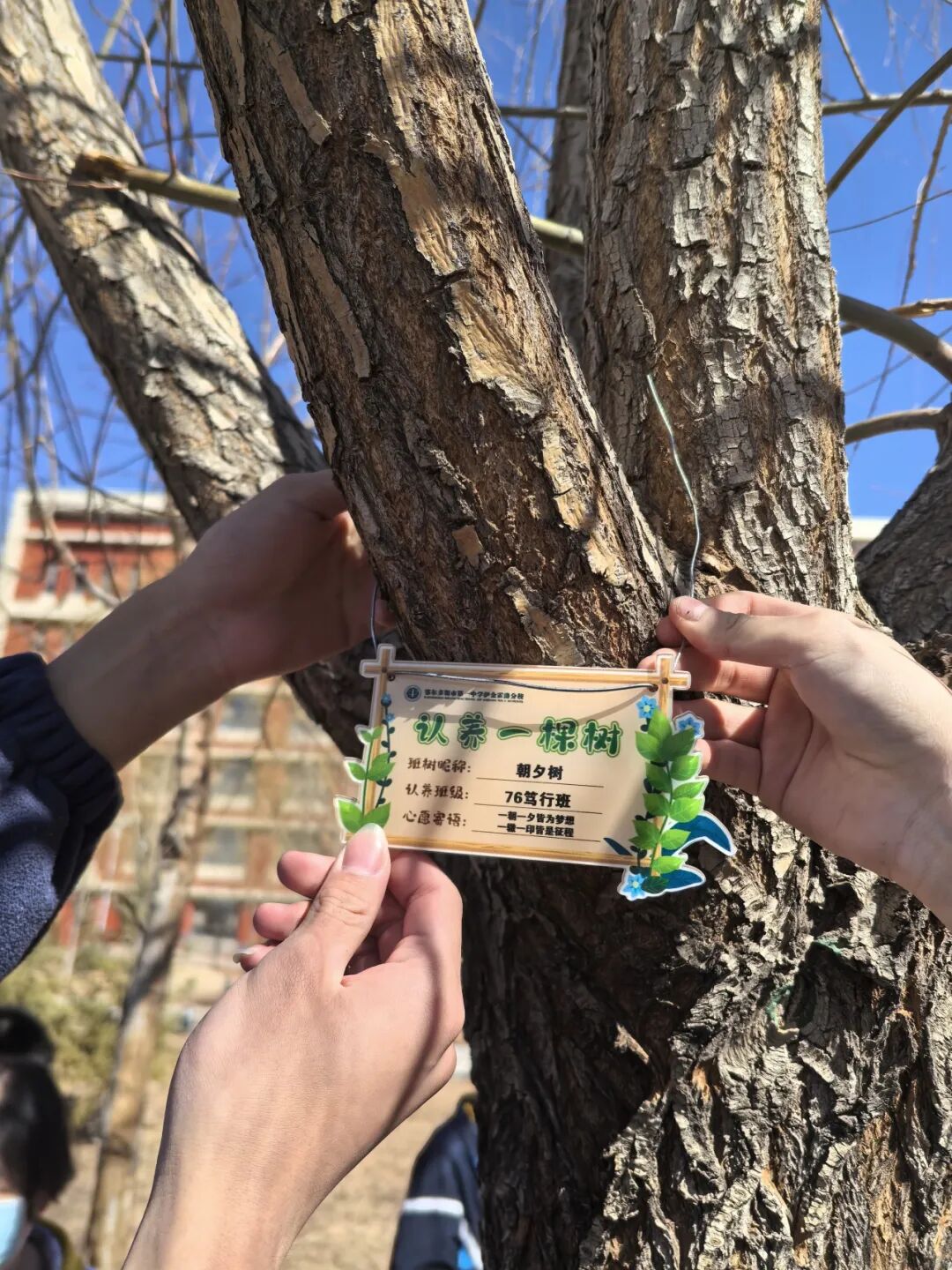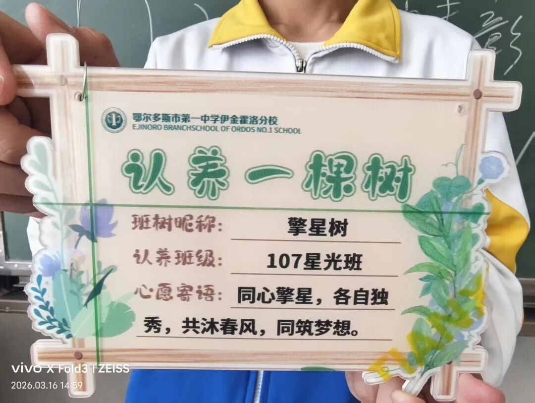 活动中,各班以班级为单位开展认养仪式,将精心制作的认养牌悬挂于树上,在绿意盎然中寄托成长愿景。同时,围绕班树开展“我画我的班树”“我写我的班树”以及“班级创意合影”等系列活动,同学们用画笔记录树木之美,用文字表达真挚情感,用镜头定格青春记忆,在参与中增强了班级凝聚力与集体认同感。。