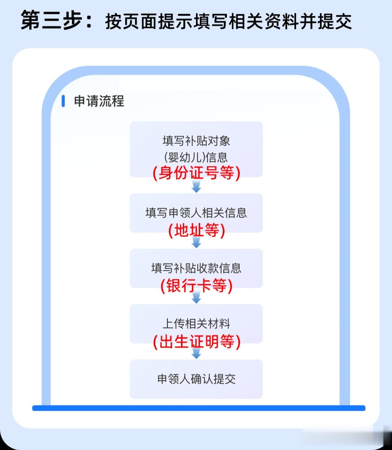 宝宝信息:填宝宝的身份证号等(新生儿没身份证就用出生证明上的编号);申领人信息:比如宝爸宝妈的地址、联系方式(填自己常用的);收款信息:绑定一张银行卡,补贴会打到这里(建议用常用的储蓄卡);上传材料:出生证明、户口本(宝宝页)的电子版(提前用手机拍好,清晰点)。