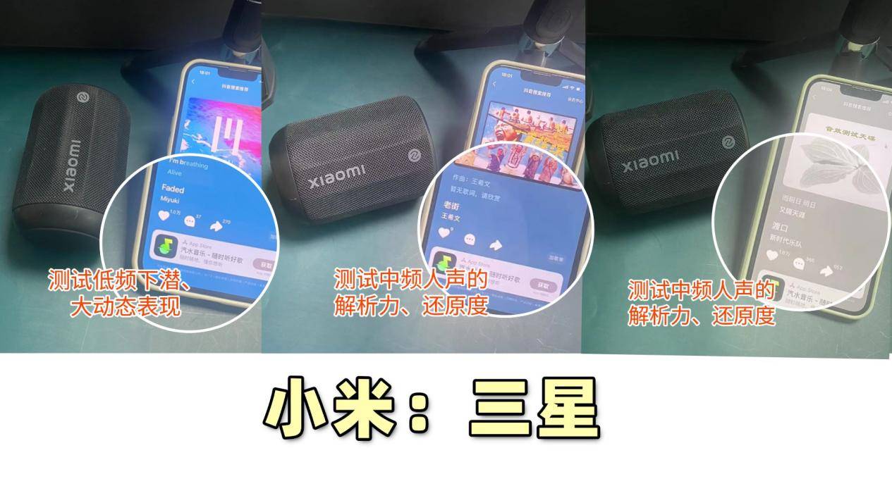 1. 三款音箱均充满至 100% 电量,连接同一部手机,循环播放同一套 10 首无损歌单