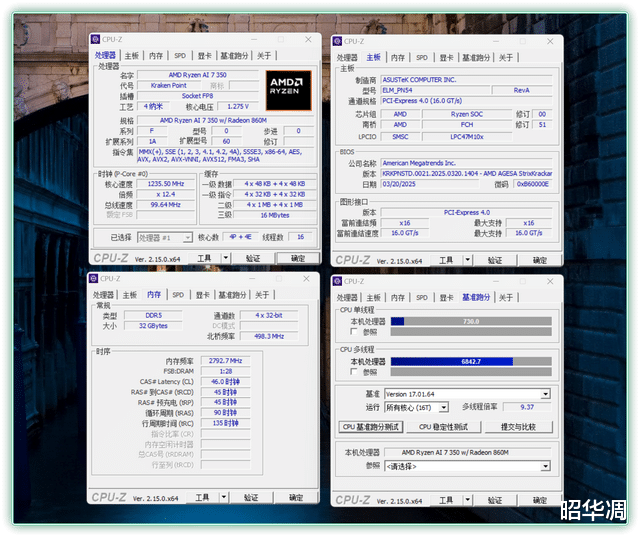 ▼CPU-Z 测试结果,单线程测试得分 730分,多线程测试 6842.7分。