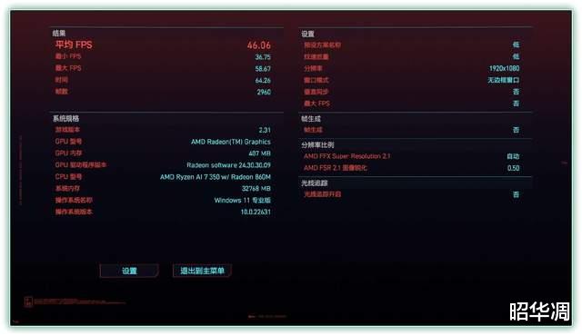 ▼赛博朋克 1080P 低画质不开光追的情况下有 46FPS 左右