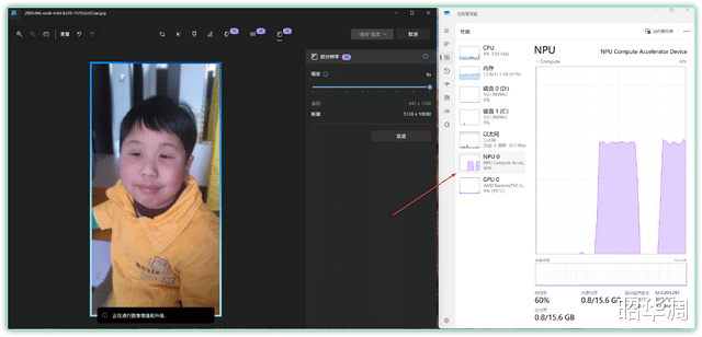 ▼其中的超分辨率功能,目前只能在搭载 NPU 的主机上使用,比如下图就是利用这个功能对低分辨率图片进行高清化,此时的 NPU 就处于运行状态。
