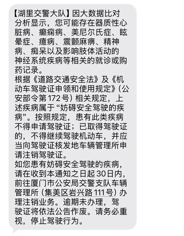 厦门湖里区交警随后也出面解释,说短信只是提醒而非直接注销,收到通知的驾驶员可以去核实情况,签个承诺书或者开个医院证明就行。话虽如此,可问题远没有这么简单。