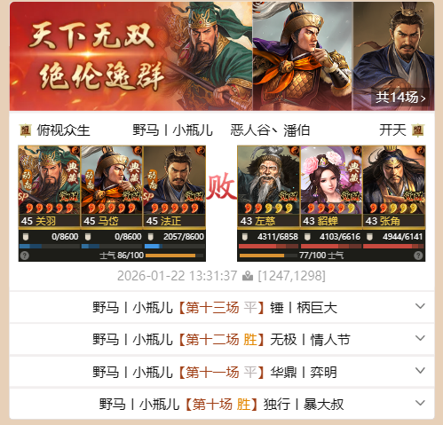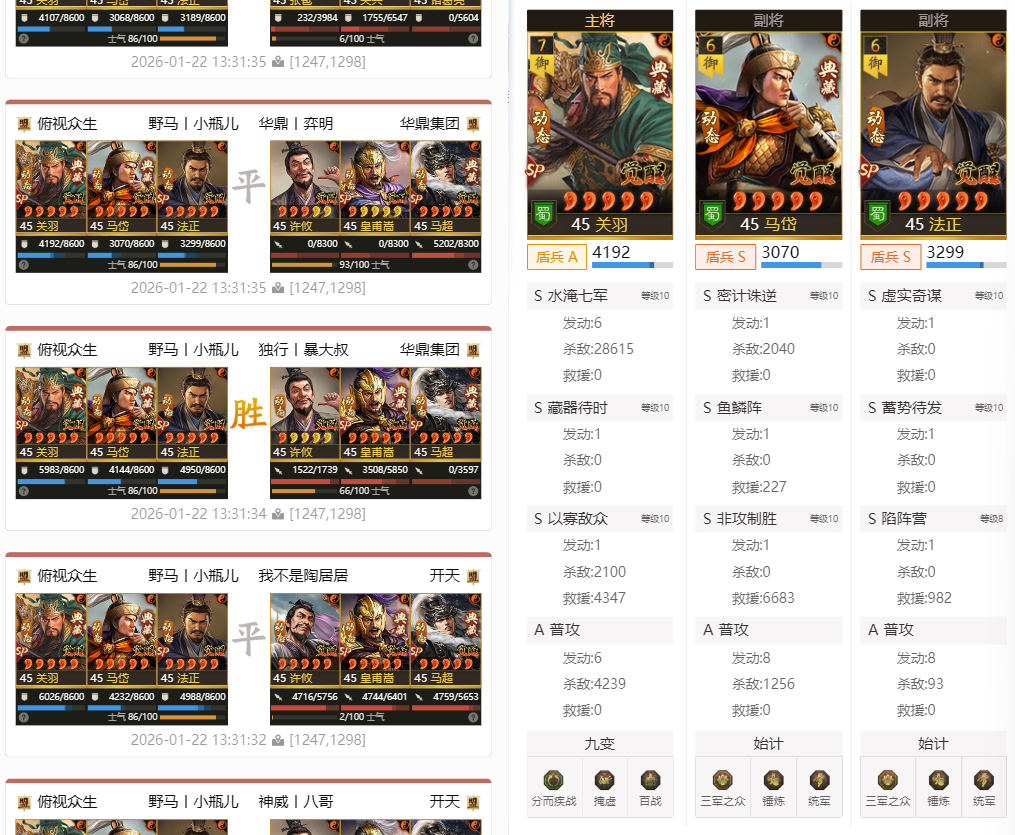 另一只打出天下无双的阵容,法官盾,sp关羽+法正+马岱,鏖战14场打出天下无双。