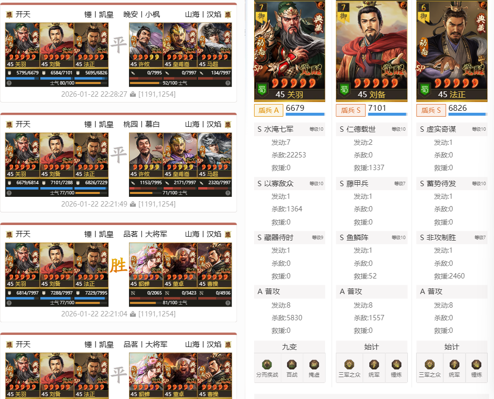 首先是大家最关心的,拒马弓鏖战13场打出天下无双,凭借着高统率和高回复,对皇马枪还是有不小的优势。SP曹操:桃园结义、雁行阵SP卢植:先登死士、草船借箭SP貂蝉:深藏若虚、戮力同心