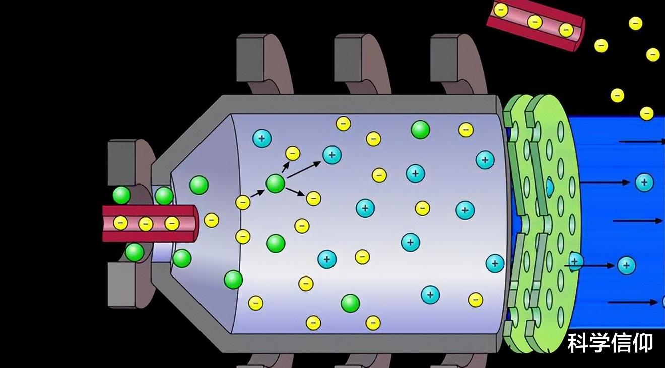 离子在喷出的过程中会与电子发生中和,形成电中和的废气,这些喷出的废气就会反向推动航天器向前运动。