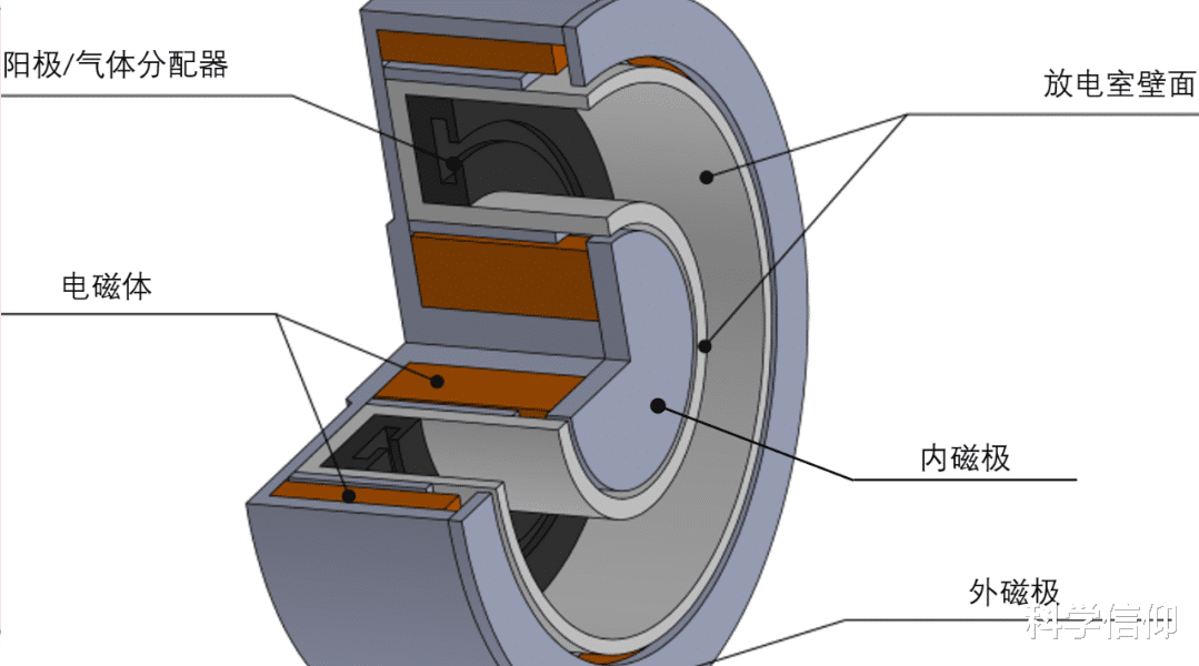 霍尔推进器的内部构造其实很简单,它由两个一侧封闭、一侧开口的同心圆柱组成,在两个圆柱的中间是一个放电通道,用于向后喷射离子。