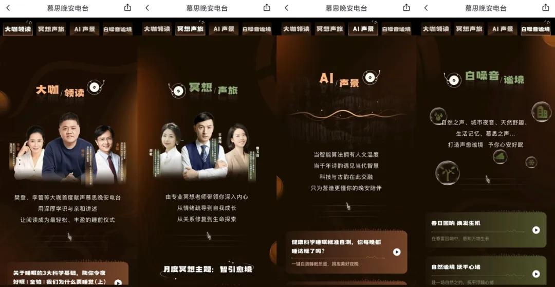 为了解决这一痛点,慕思与喜马拉雅合作,定制“慕思晚安电台”:每月批量更新、确保供应持续性;内容涵盖AI哄睡、白噪音、冥想等不同形式,并联合樊登读书制作“大咖讲书”栏目,适配不同人群的需求。