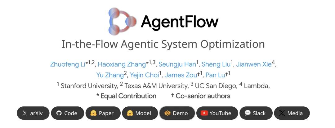 论文地址:https://arxiv.org/abs/2510.05592项目主页:https://agentflow.stanford.edu/Github仓库:https://github.com/lupantech/AgentFlow在线Demo:https://huggingface.co/spaces/AgentFlow/agentflowYouTube视频:https://www.youtube.com/watch?v=kIQbCQIH1SI
