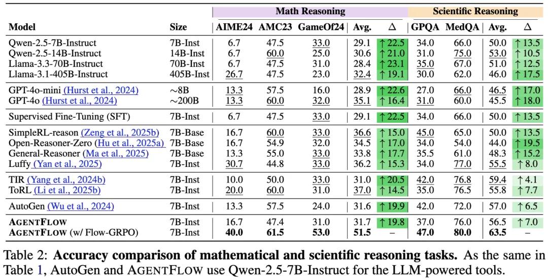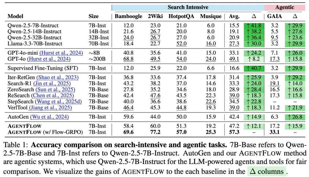 以Qwen-2.5-7B-Instruct为基座模型的AgentFlow在各项基准上均超越现有领先方法: